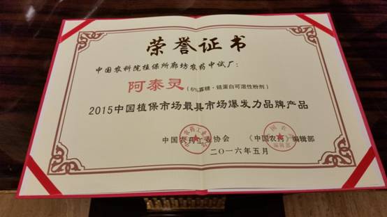 阿泰靈榮獲生物農藥暢銷品牌產品第一名