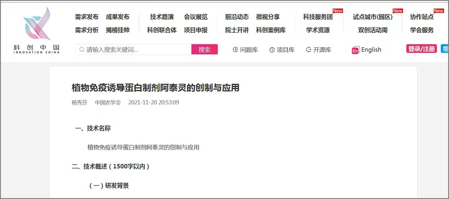 植物免疫誘導(dǎo)蛋白制劑阿泰靈的創(chuàng)制與應(yīng)用”得到評(píng)審專家的認(rèn)可,成功入選并入駐“科創(chuàng)中國” ...全文分類[ 中保新聞 ] 2021-12-17